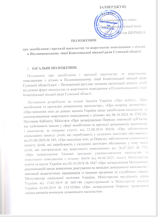 6.2. Учасники освітнього процесу мають бути ознайомлені з Положенням про запобігання і протидію насильству та жорстокому поводженню з дітьми в Підлипненському ліцеї Конотопської міської ради Сумської області
